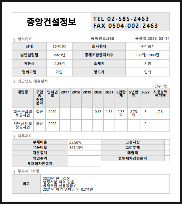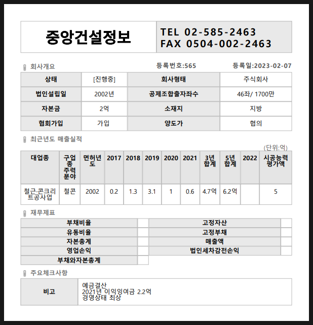 중앙건설정보(대표전화 02-585-2463)는 종합건설업, 전문건설업(철근콘크리트공사업) 신규등록, 건설업법인설립, 양도양수, 영업정지 행정심판 등 건설면허 행정처분 대응 업무를 일관서비스로 지원합니다.