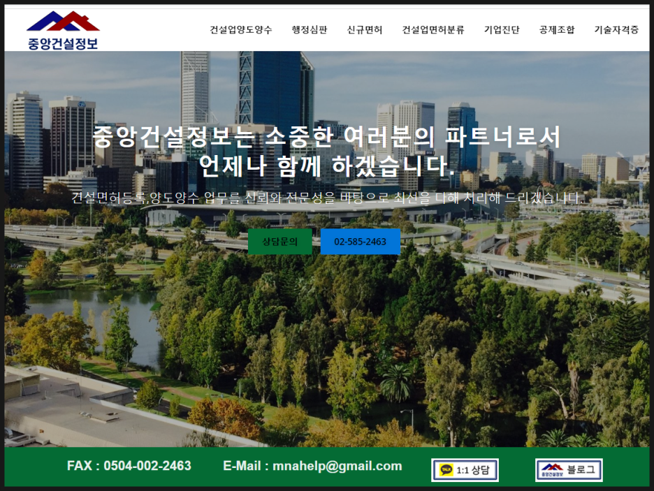 중앙건설정보(대표전화 02-585-2463)는 종합건설업, 전먼건설업 신규등록과 건설법인 설립, 법인면허 양도양수, 건설업 영업정지, 과징금, 등록말소 등 면허관련 행정처분 대응절차 대행과 컨설팅업무를 일관서비스하고 있습니다.
