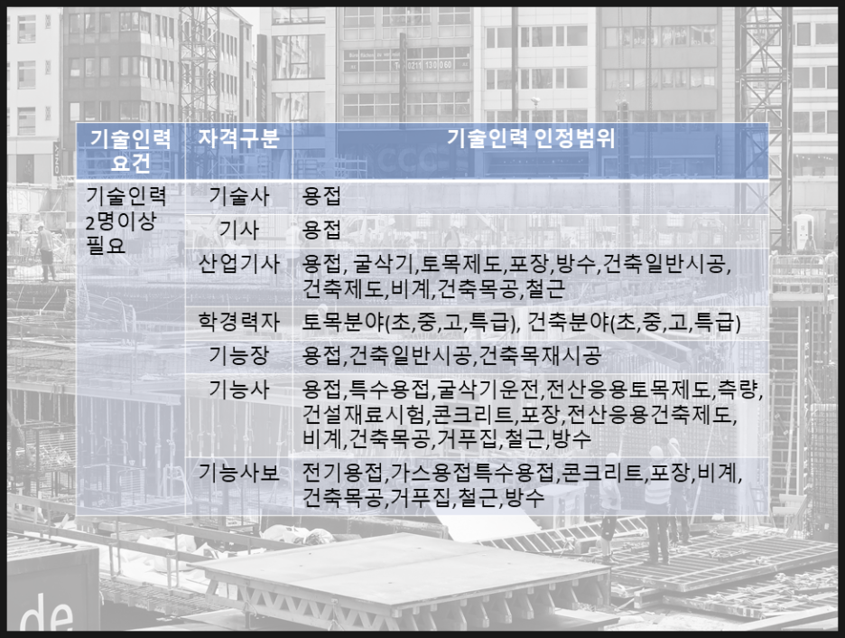 한국기술인협회에서 발행하는 토목, 건축분야의 초급 이상 경력 수첩을 보유하거나 다음과 같이 해당 면허와 관련이 있는 국가기술자격증을 보유해야 합니다.